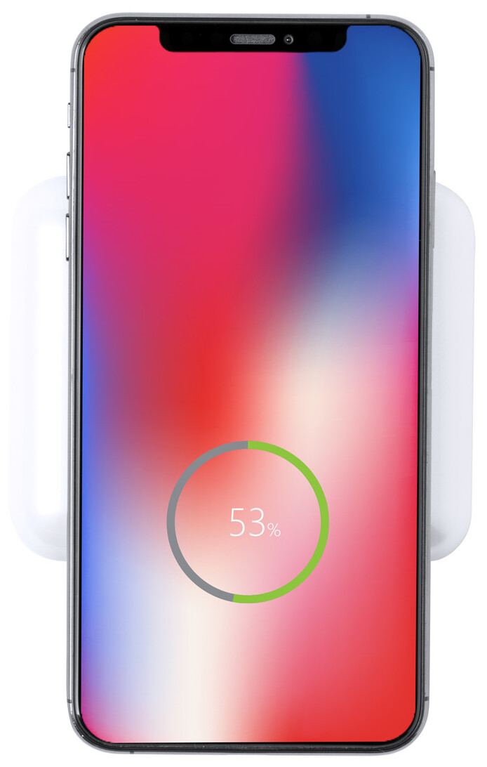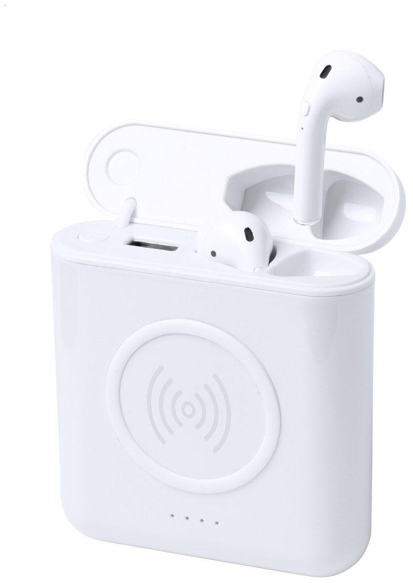 Plastová USB powerbanka s baterií 5000 mAh, vestavěnou bezdrátovou nabíječkou (5 W) a skutečnými bezdrátovými stereofonními sluchátky (TWS) s funkcí hands-free volání. Vstupní port USB-C. Včetně nabíjecího kabelu USB.