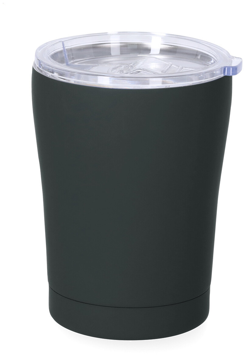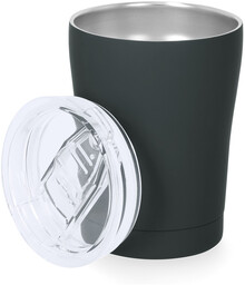 Dvoustěnný, nerezový izolovaný termo hrnek s pogumovanou úpravou a víčkem na pití, 350 ml.