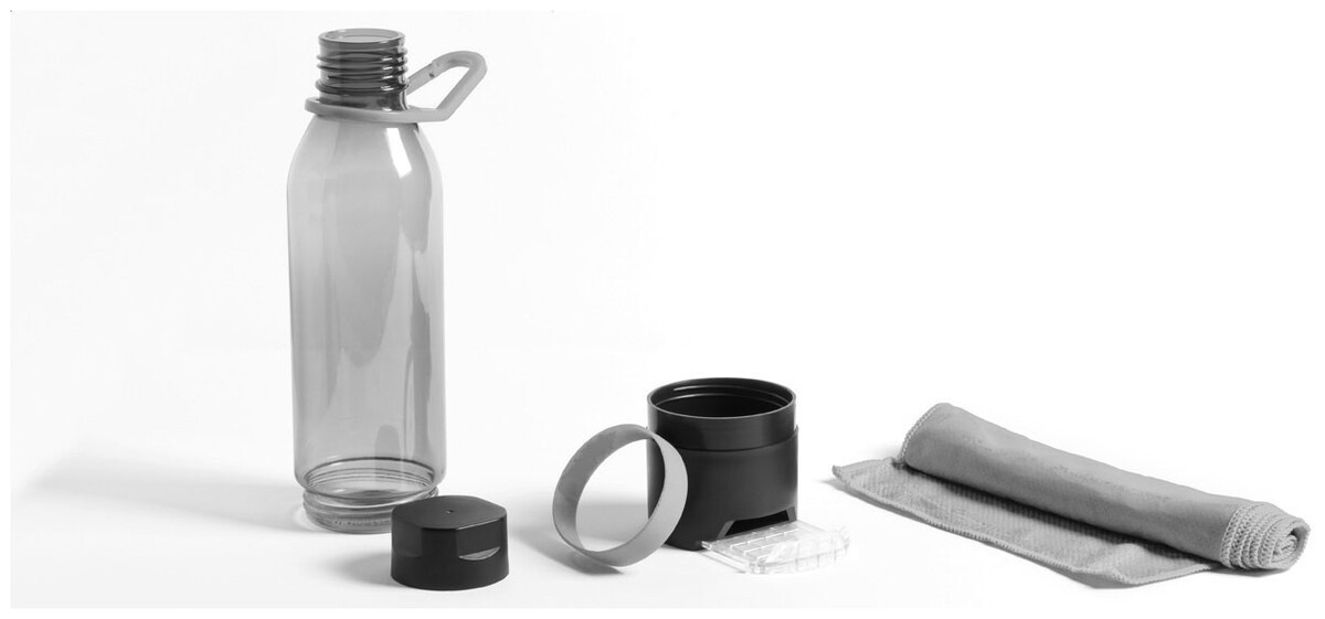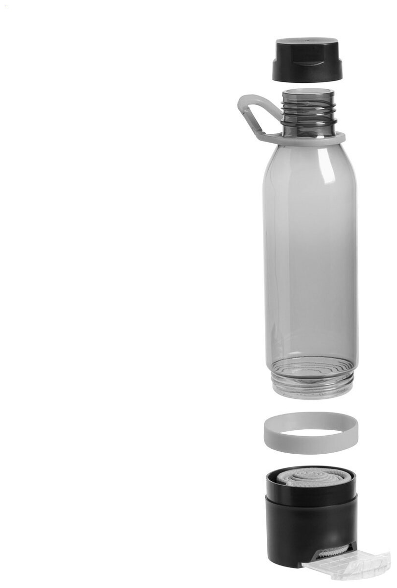 Plastová multifunkční sportovní láhev s chladicím ručníkem (390 g/m2) ve spodní přihrádce a výsuvným držákem na mobilní telefon. V dárkovém balení. Objem 650 ml. Není vhodná pro sycené nápoje.