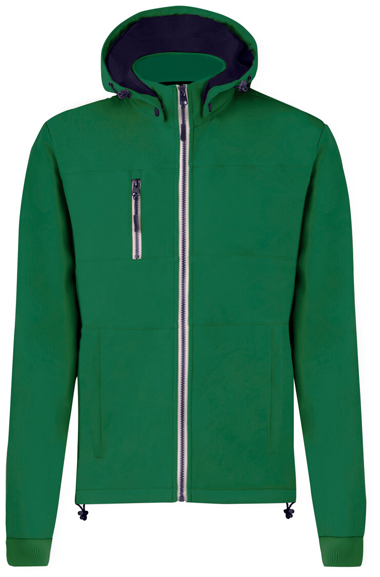 Větru a voděodolná softshellová bunda na zip se 2 bočními kapsami, 1 přední kapsou, stojáčkem a odepínací kapucí. 100% polyester, 300 g/m2.