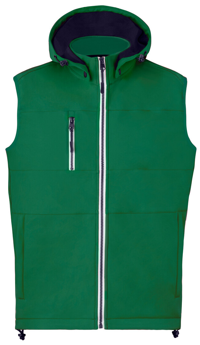 Větru a voděodolná softshellová vesta na zip se 2 bočními kapsami, 1 přední kapsou, stojáčkem a odepínací kapucí. 100% polyester, 300 g/m2.