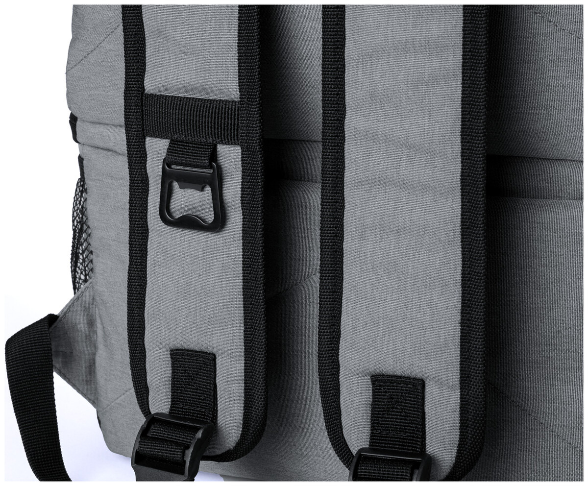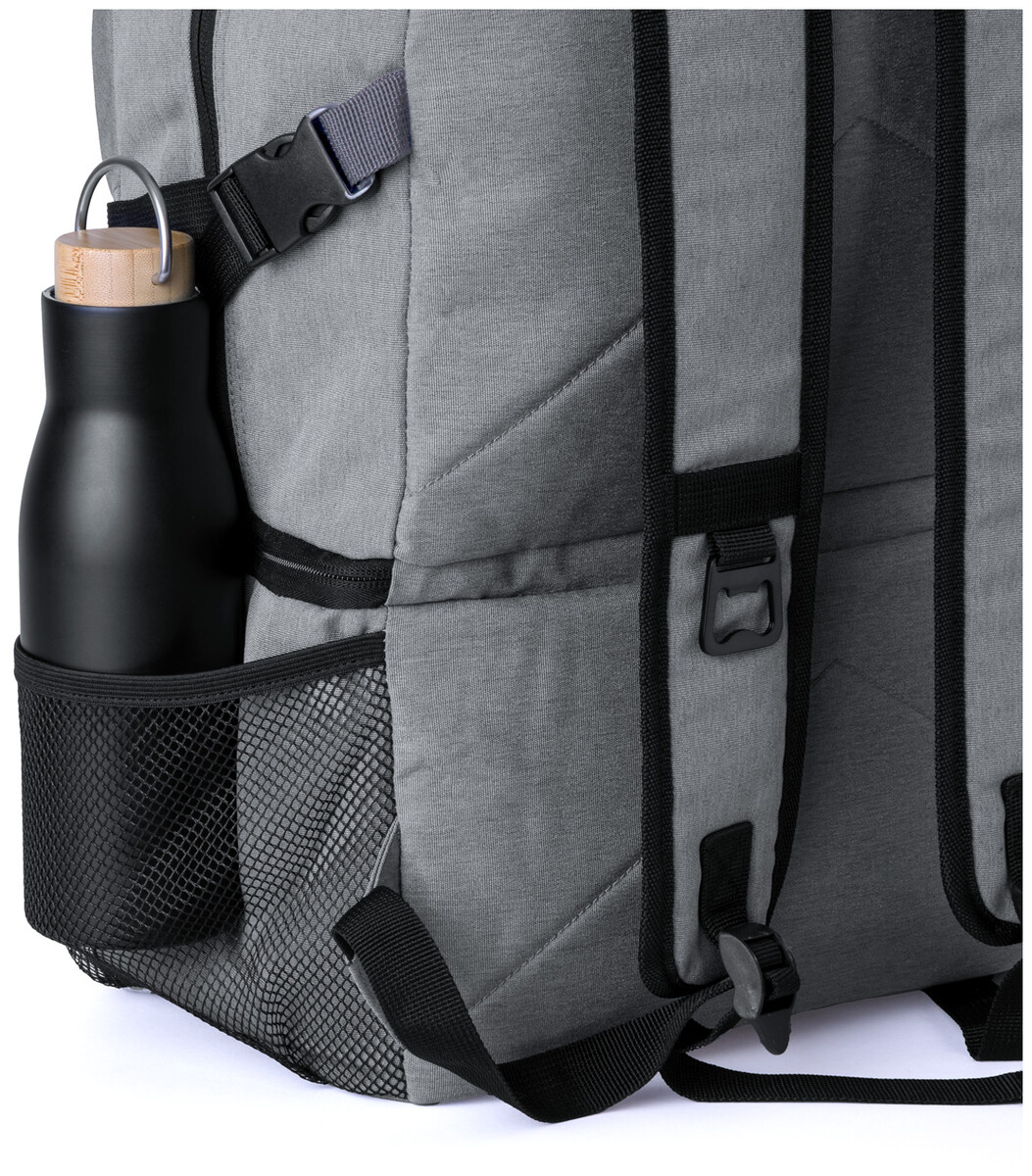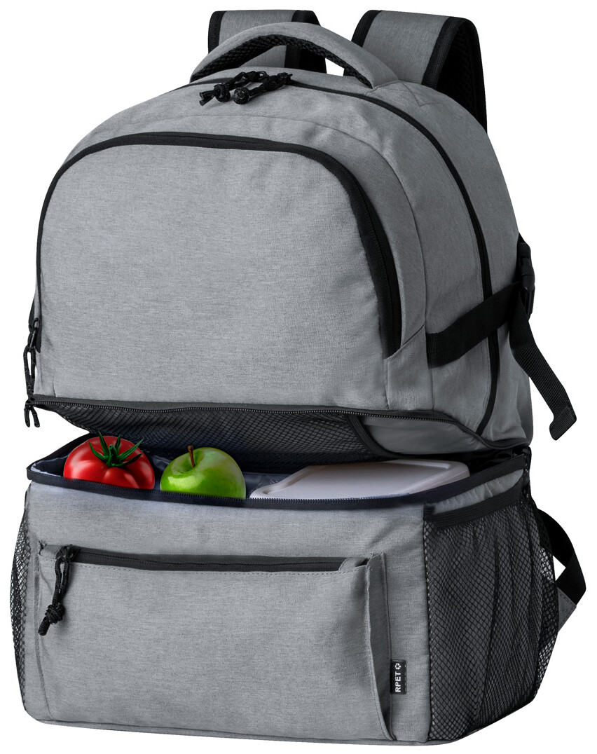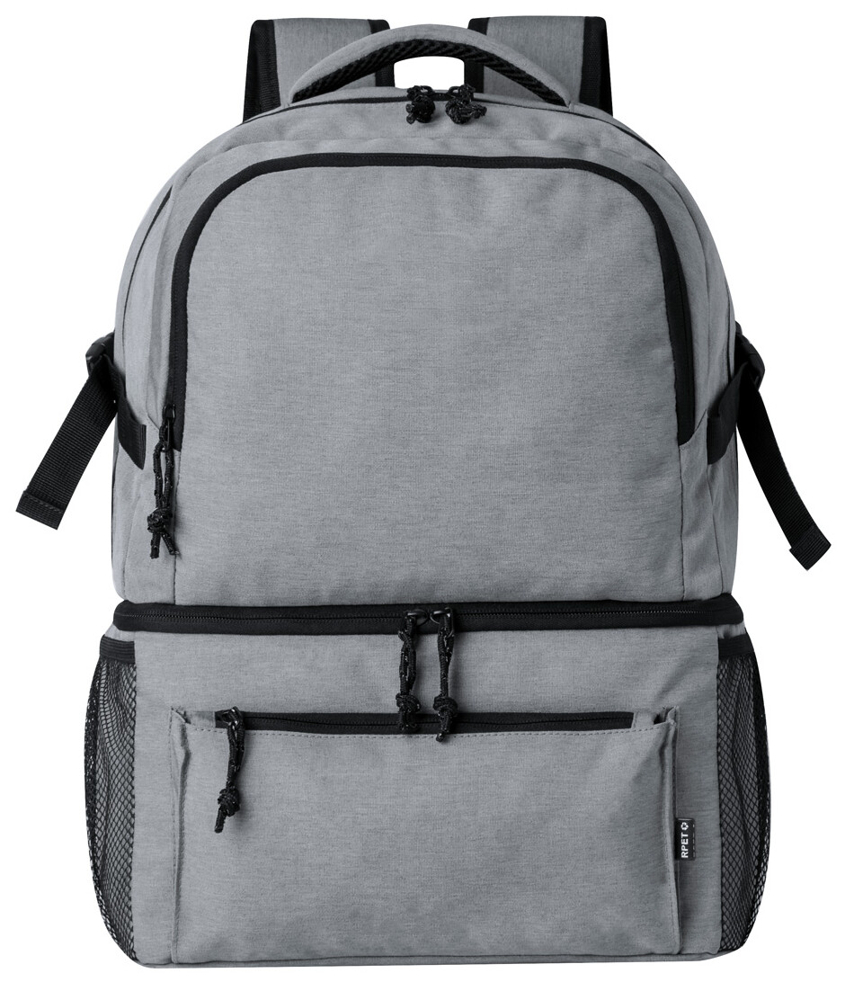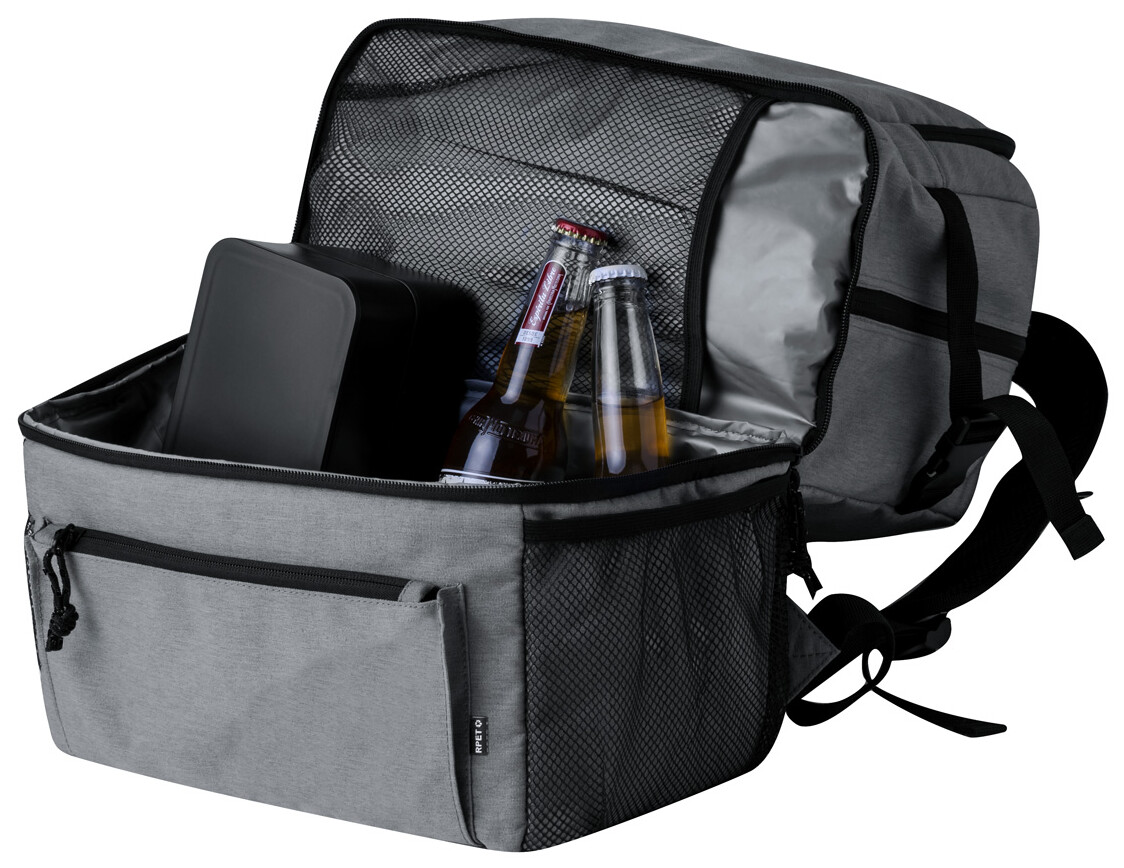 RPET batoh s PEVA polstrovanou chladicí přihrádkou, kapsami na zip, bočními síťovanými kapsami, polstrovanými zády a ramenními popruhy. Polyester 600D RPET, s výrazným štítkem RPET.