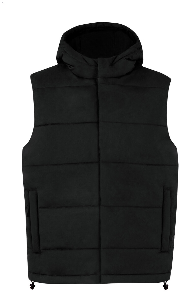 Větru a vodě odolná, vatovaná vesta s dvojitým předním zipem a knoflíkem. S kapucí a bočními kapsami. 100% polyester.
