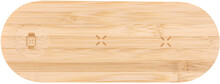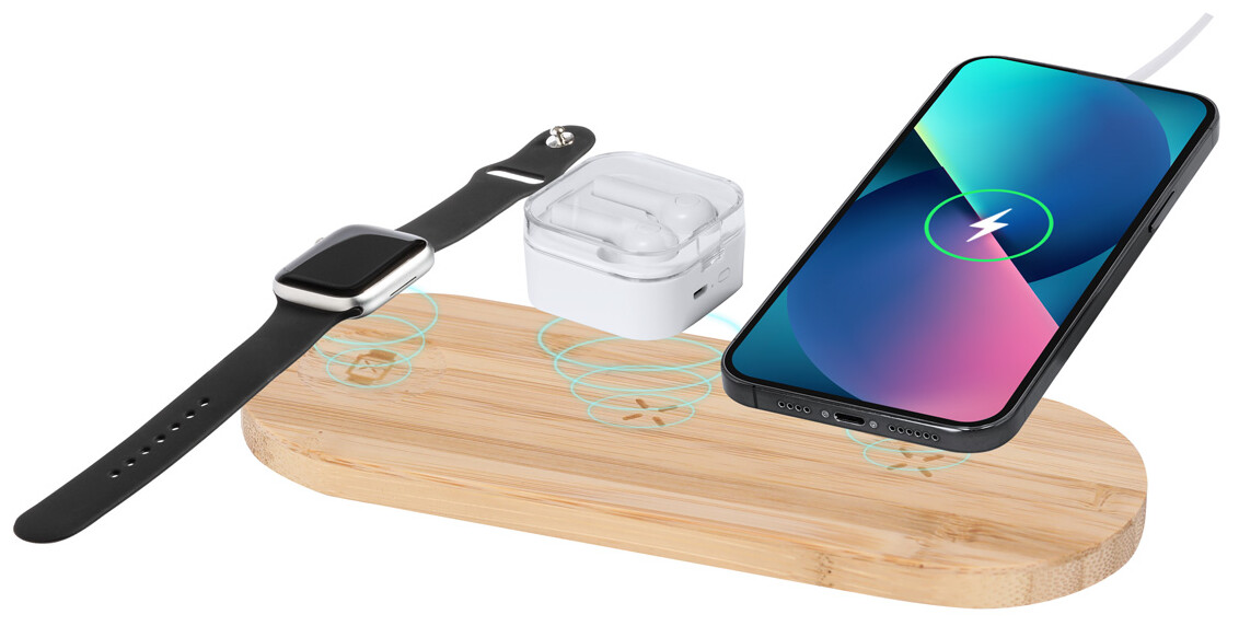 Bambusová bezdrátová rychlonabíječka (15W) se 3 bezdrátovými nabíjecími plochami pro současné nabíjení mobilního telefonu, sluchátek a chytrých hodinek. Včetně USB nabíjecího kabelu.