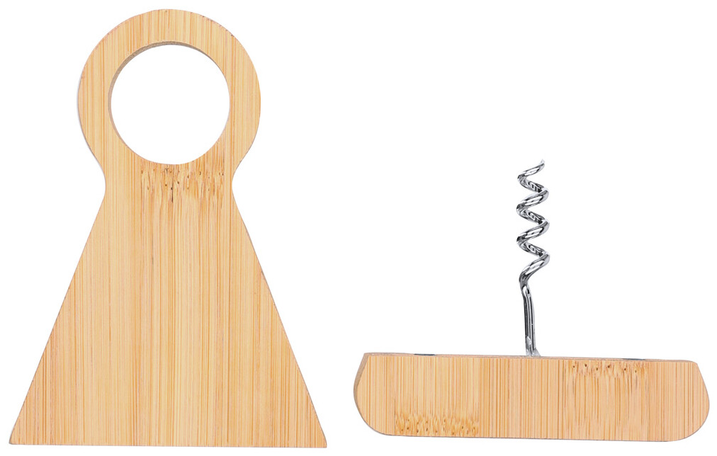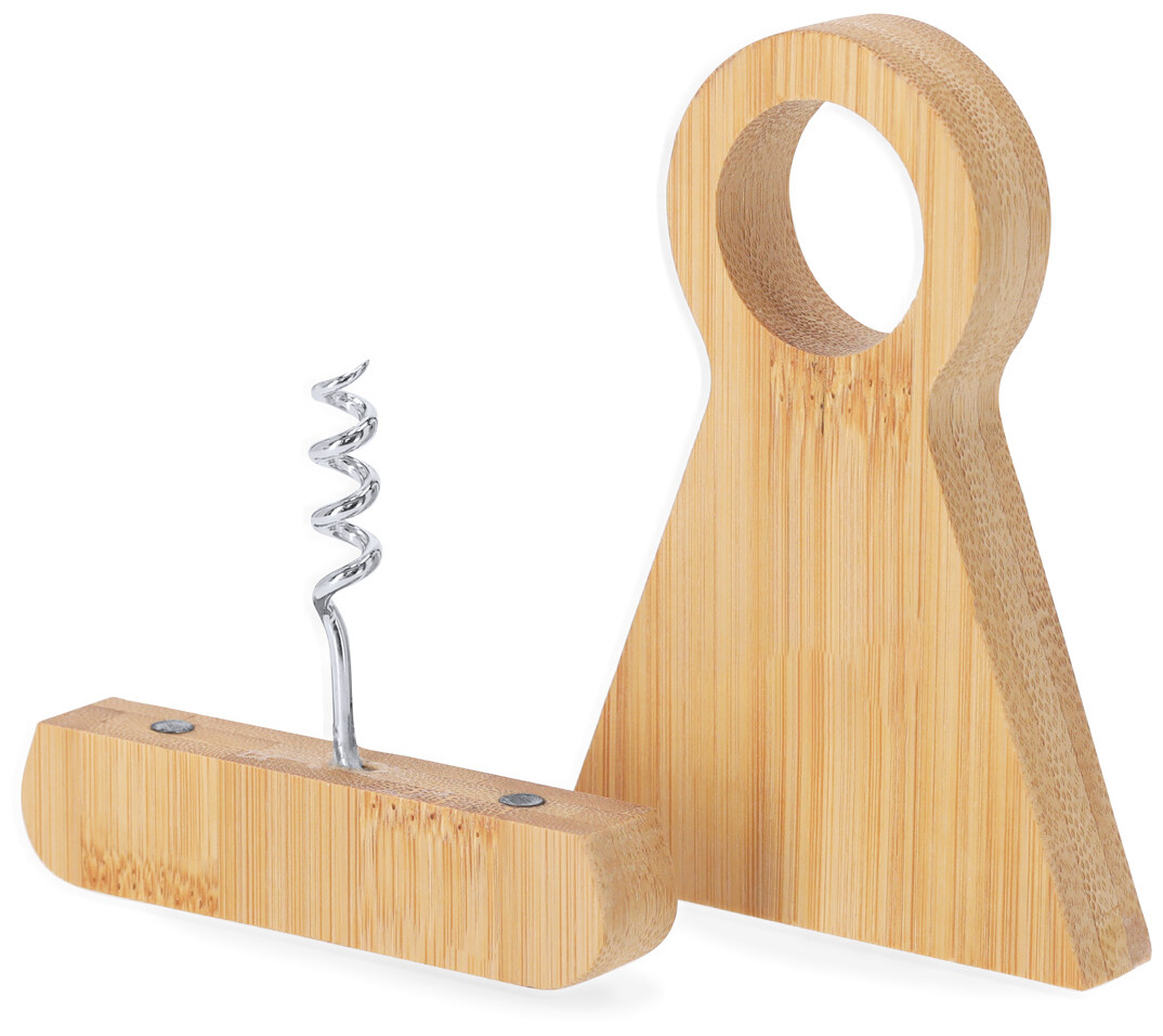 Bambusový držák na láhev s nerezovou vývrtkou.