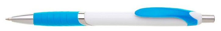 Plastová propiska s bílým tělem tyrkysovým úchopem a klipem a stříbrnými doplňky.