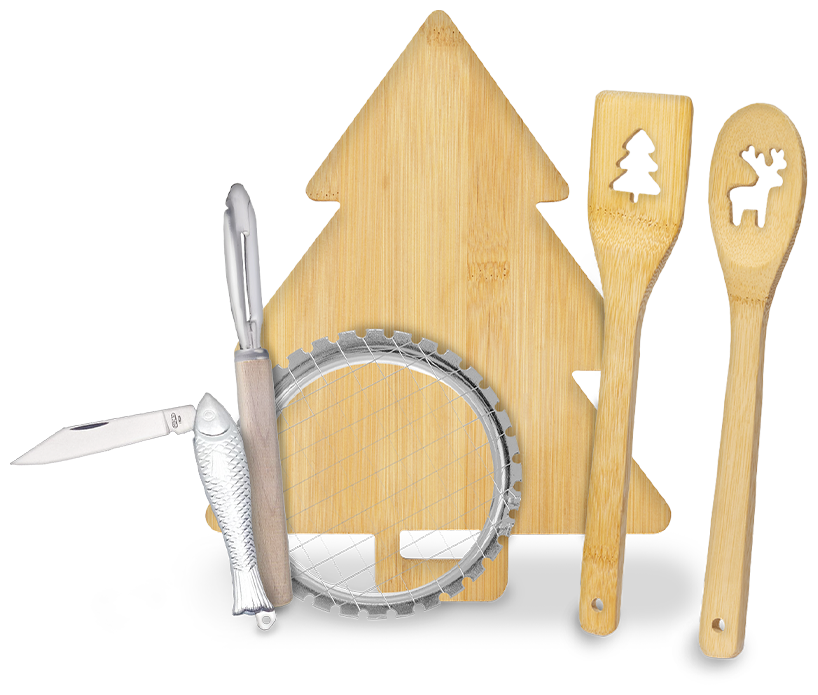 Zavírací nůž "Rybička", Kuchyňská škrabka, Kráječ na brambory a zeleninu, Krájecí prkénko z bambusu ve tvaru stromečku, Vánoční naběračky na salát z bambusu 2 ks