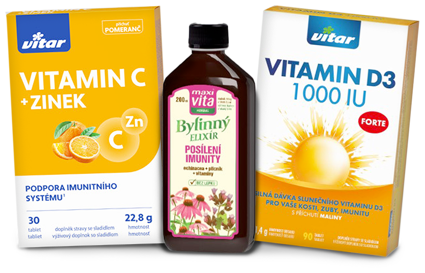 Vitamín C + zinek, 30 tablet s příchutí pomeranče, Bylinný elixír echinacea na posílení imunity, 200 ml, Vitamín D3 1000 IU, 90 tablet s příchutí maliny