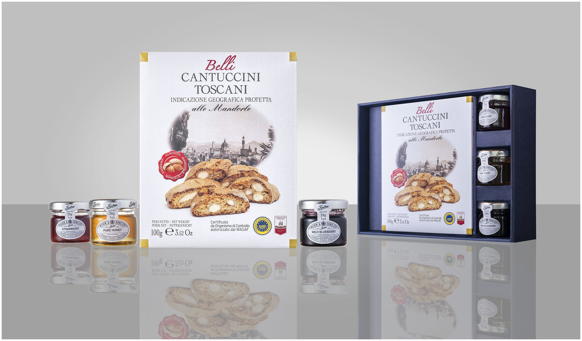mandlové sušenky Cantuccini 100 g, Wilkin & Sons džem jahodový 28 g, Wilkin & Sons džem borůvkový 28 g, Wilkin & Sons Med 28 g