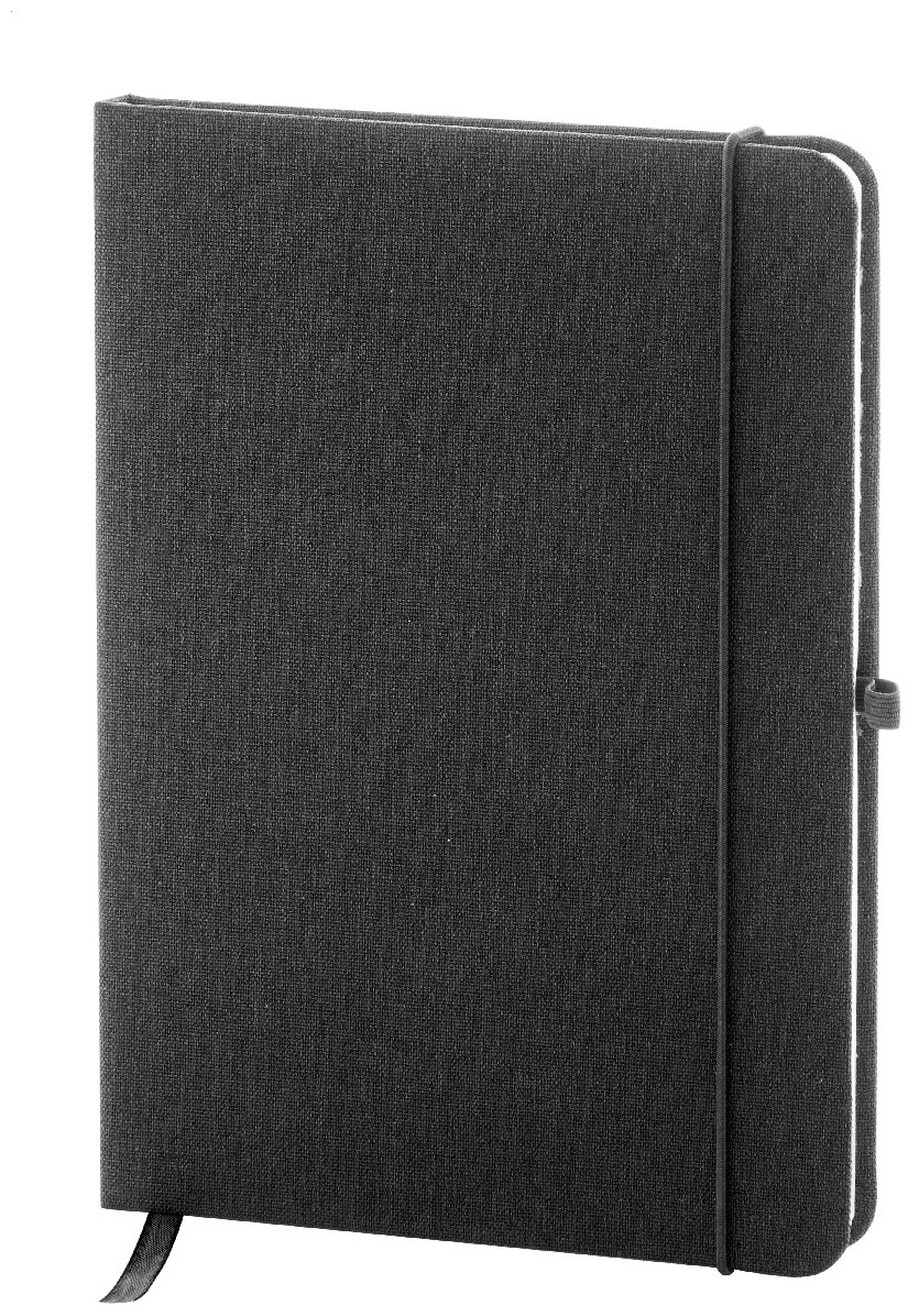 Blok A5 potažený polyesterem 300D RPET s 80 čistými listy. S gumovým páskem, záložkou a držákem na pero.