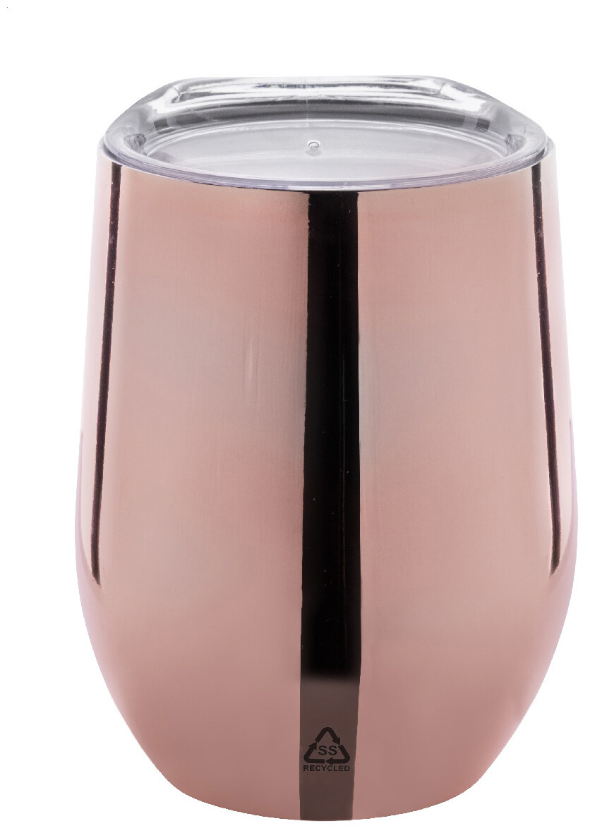 Dvoustěnný termohrnek z recyklované nerezové oceli s vysoce lesklou kovovou povrchovou úpravou a plastovým víčkem. 350 ml.