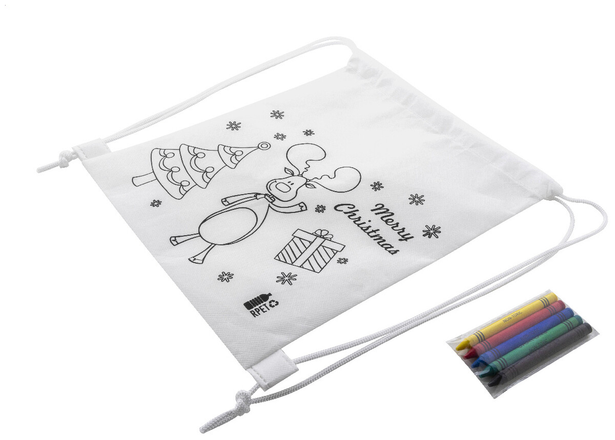 Vánoční vak na vybarvování se stahovací šňůrkou z netkané RPET tkaniny s 5 voskovkami.