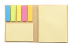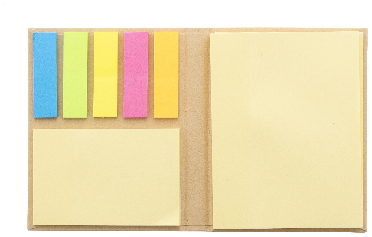 Samolepicí poznámkový blok z recyklovaného papíru s 50 velkými a 25 středními žlutými poznámkami a 125 značkovači stránek (v 5 barvách).