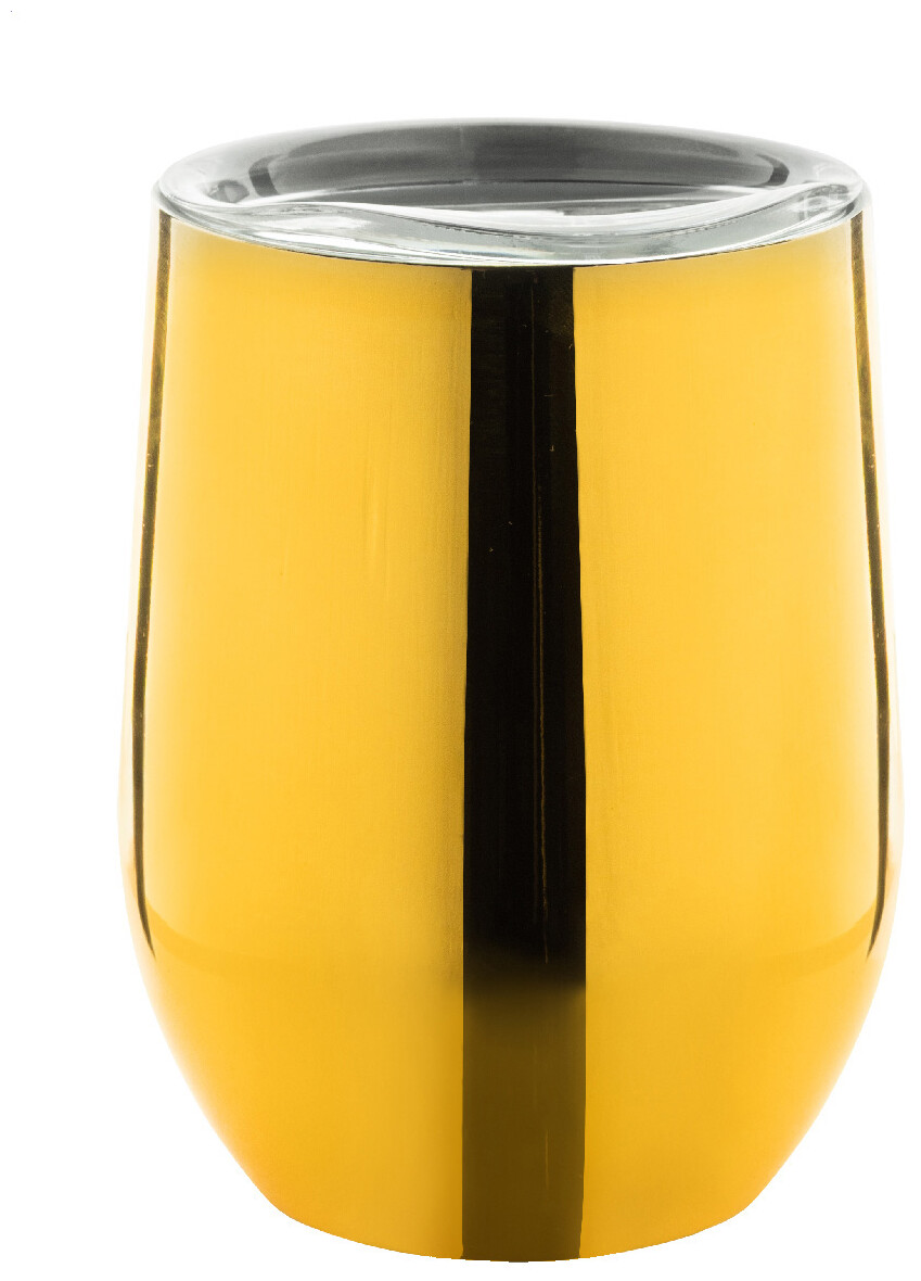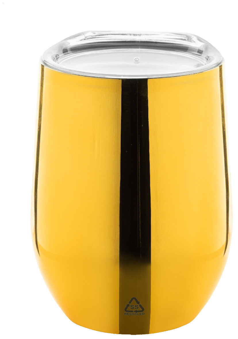 Dvoustěnný termohrnek z recyklované nerezové oceli s vysoce lesklou kovovou povrchovou úpravou a plastovým víčkem. 350 ml.