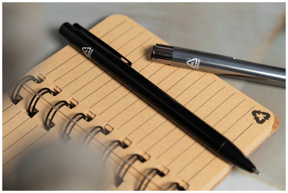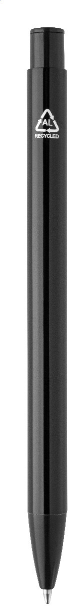 Kuličkové pero z recyklovaného hliníku s lesklým kovovým povrchem. S modrou náplní.