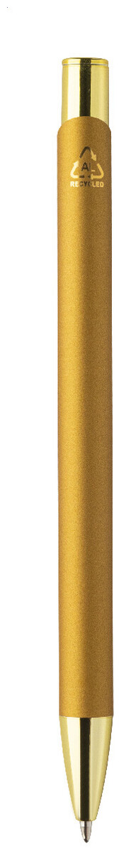 Kuličkové pero z recyklovaného hliníku s pogumovaným tělem a barevnými lesklými kovovými díly. Se speciálním povrchem pro zrcadlové gravírování, které odpovídá kovovým částem. S modrou náplní.