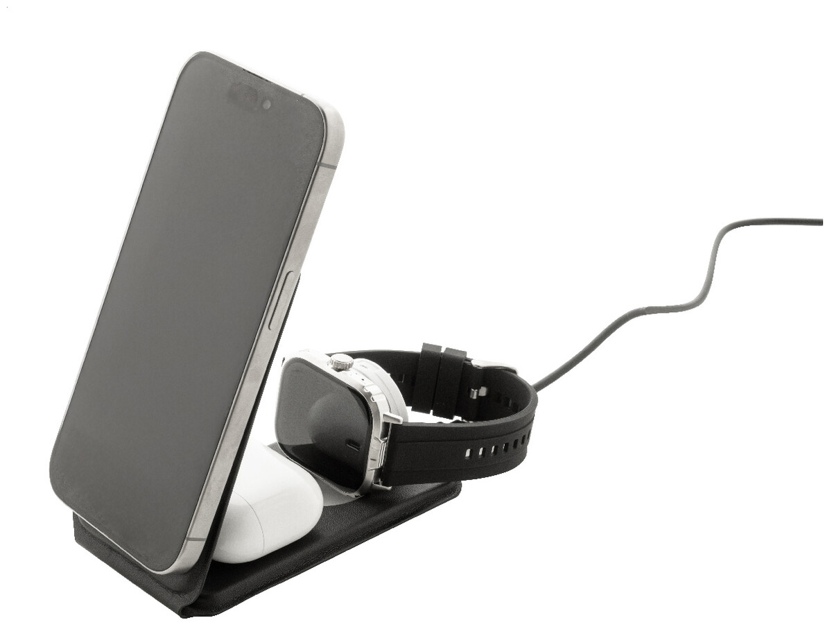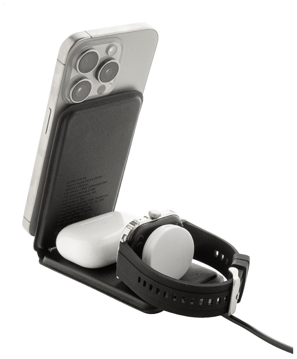 Luxusní skládací držák na mobilní telefon a bezdrátová nabíjecí sada z recyklované PU kůže. S magnetickou bezdrátovou rychlonabíječkou (15 W), bezdrátovou nabíječkou (5 W) pro sluchátka (pouze Apple®) a bezdrátovou nabíječkou (2,5 W) pro chytré hodinky (Apple® a Samsung®). Včetně samolepicího kovového kroužku pro použití magnetické funkce na jakémkoli bezdrátově nabíjecím zařízení. Kompatibilní s iPhone® 12 nebo novějším. Včetně USB nabíjecího kabelu.