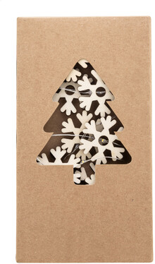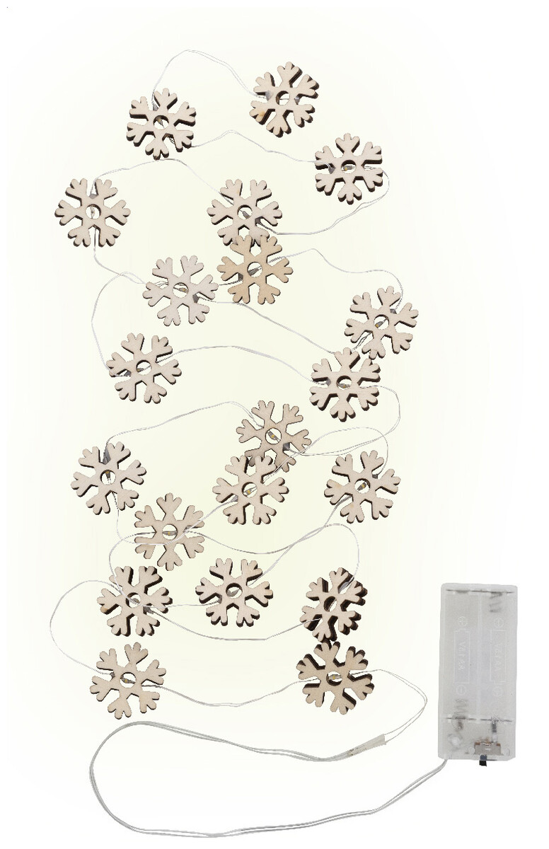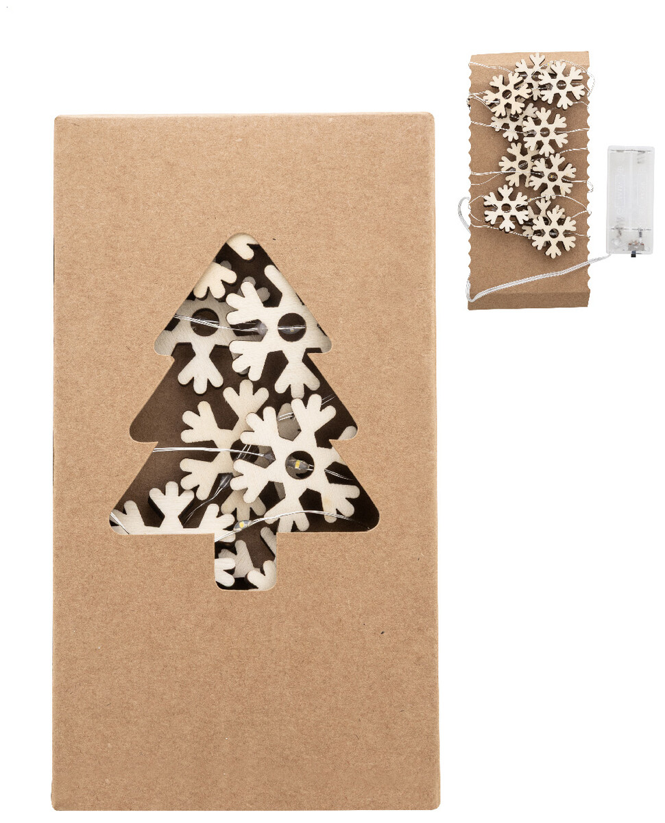 Vánoční světelná dekorace s 20 LED světly ve tvaru dřevěné sněhové vločky. Funguje na 2 AA baterie, bez baterií. S tlačítkem ZAP/VYP na pouzdře na baterie. V krabičce z kraftového papíru.
