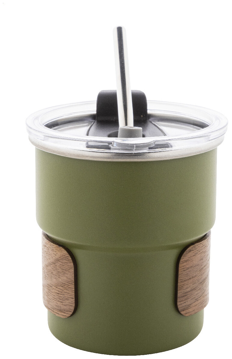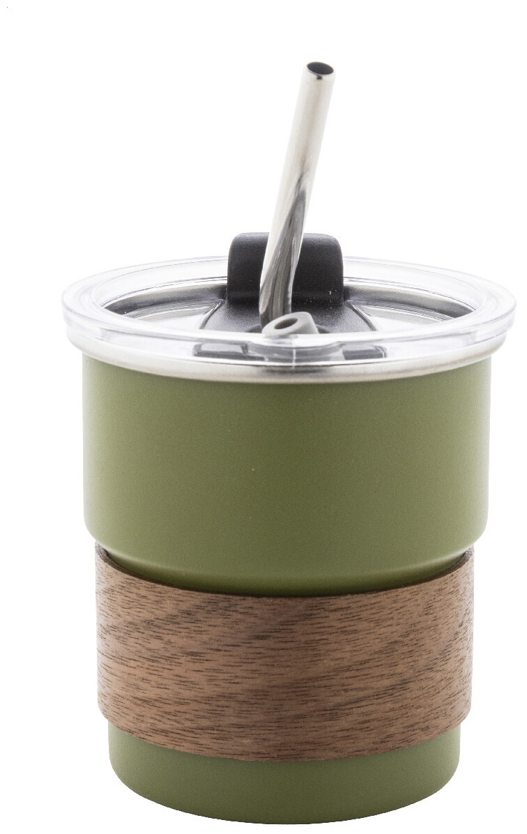 Jednostěnný cestovní hrnek z recyklované nerezové oceli s úchopem z ořechového dřeva, plastovým víčkem a brčkem z recyklované nerezové oceli. 260 ml.