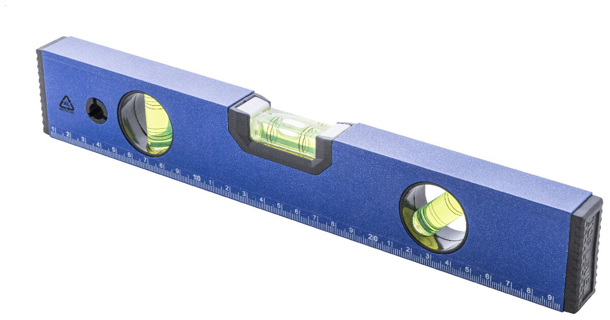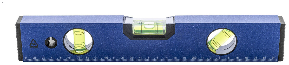 Magnetická vodováha z recyklovaného hliníku se třemi vodováhami (horizontální, vertikální a 45°) a 30cm pravítkem.