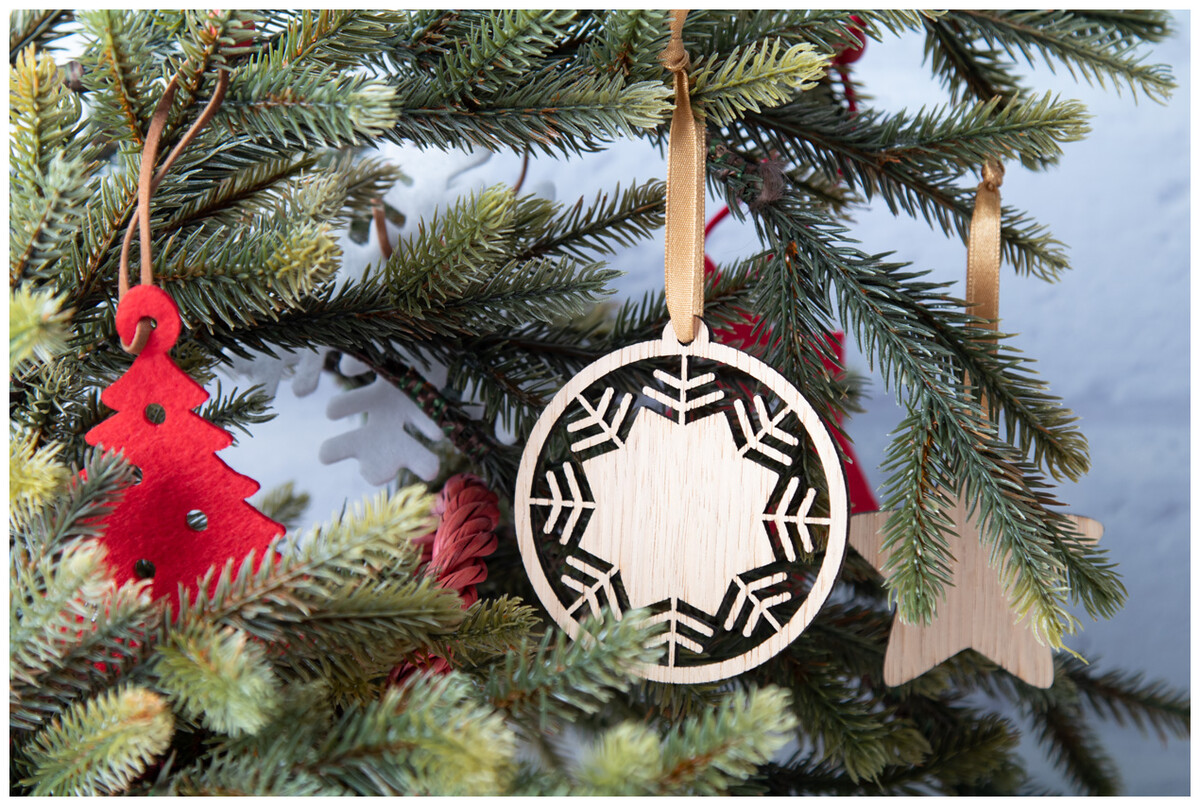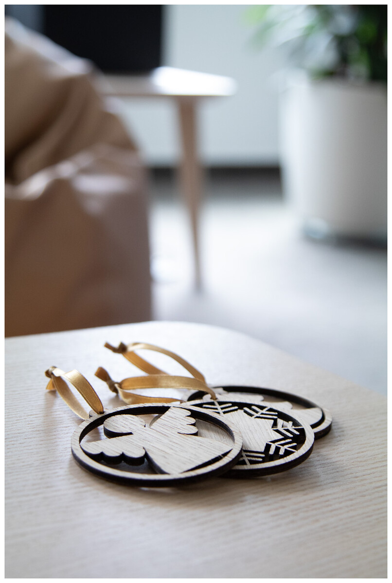 Vánoční ozdoba z dubové dýhy, dodáváno s oddělenou zlatou stužkou.