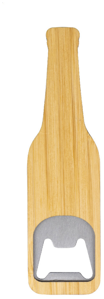 Otvírák na lahve z nerezové oceli ve tvaru lahve s bambusovým povrchem.