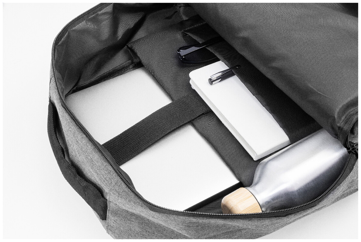 RPET batoh s hlavní přihrádkou na zip a 3 předními kapsami na zip. S polstrovanými přihrádkami na tablet (10") a notebook (15"), polstrovanými zády a ramenními popruhy. 600D RPET polyester s výrazným štítkem RPET.