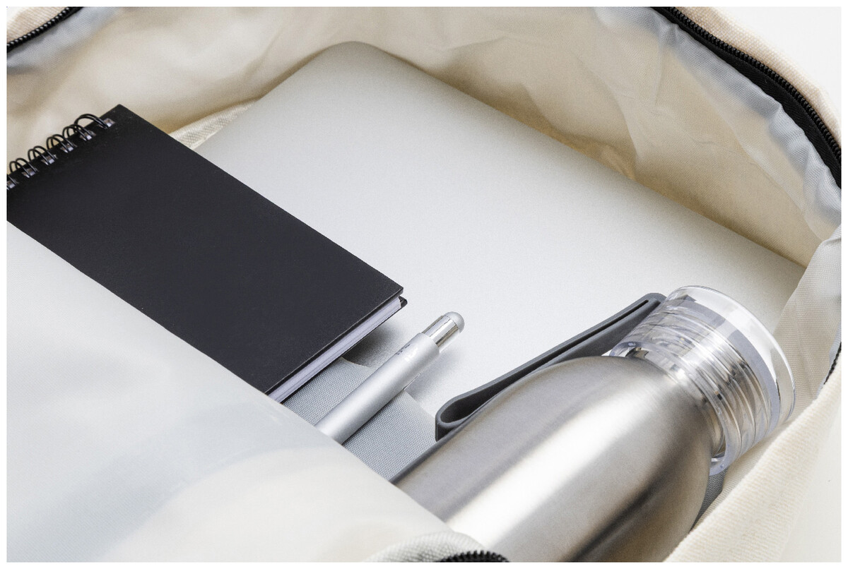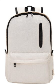 Recyklovaný plátěný batoh s hlavní přihrádkou na zip, polstrovanou přihrádkou na notebook (15"), 2 předními kapsami na zip, bočními kapsami, popruhem na kolečkách, polstrovanými zády a ramenními popruhy. 70% recyklované bavlny a 30% RPET polyesteru. S výrazným štítkem recyklované bavlny.