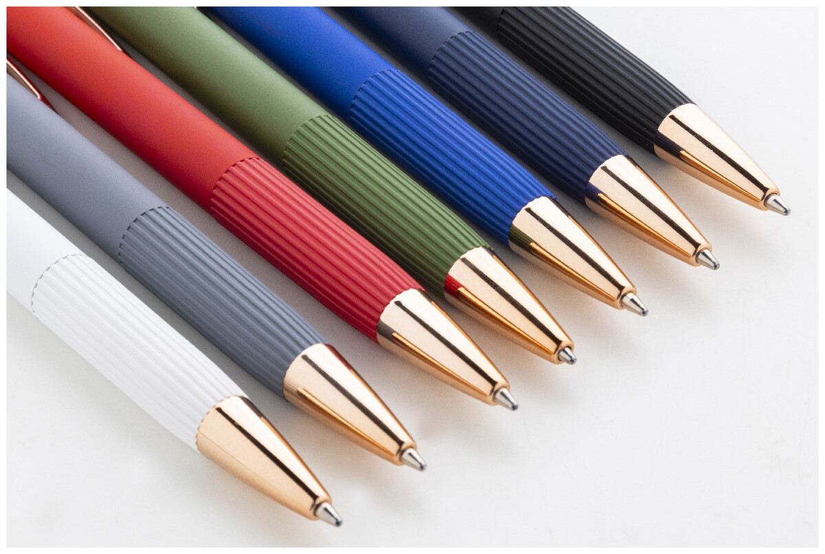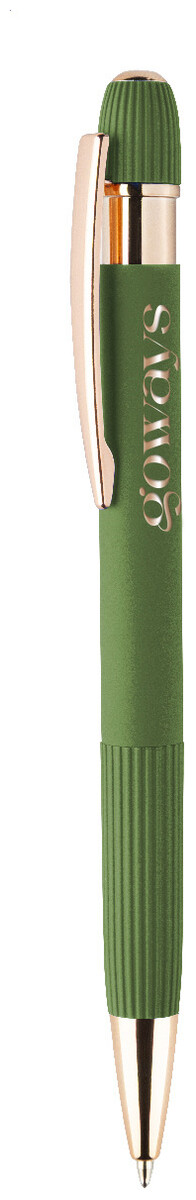 Kuličkové pero z recyklovaného hliníku s pogumovaným tělem a detaily v růžovo-zlaté barvě. Se speciálním povlakem pro zrcadlové laserové gravírování v růžovo-zlaté barvě. S modrou náplní.