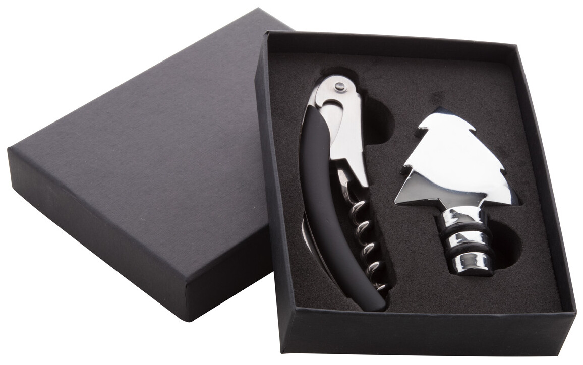 Sada na víno s vývrtkou a zátkou ve tvaru vánočního stromečku, v černé dárkové krabičce.