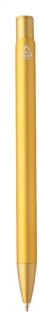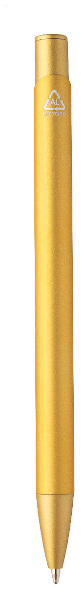 Kuličkové pero z recyklovaného hliníku s pogumovaným tělem a barevnými lesklými kovovými díly. Se speciálním povrchem pro zrcadlové gravírování, které odpovídá kovovým částem. S modrou náplní.
