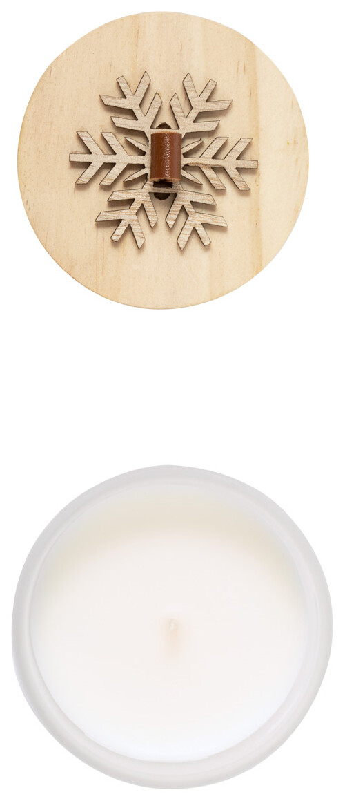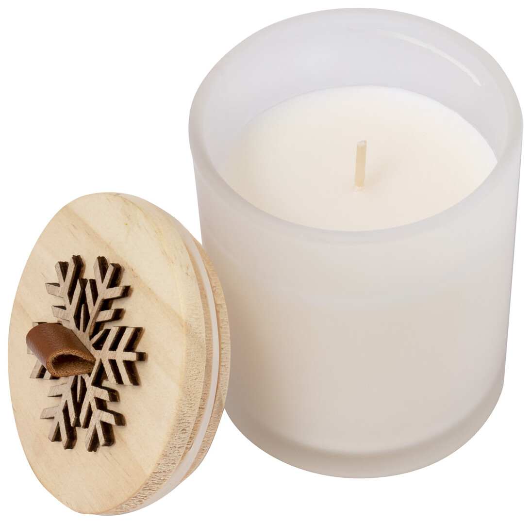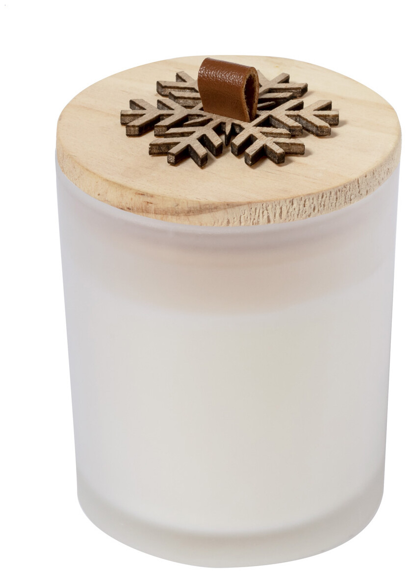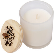 Vosková svíčka s vůní vanilky ve skleněném svícnu s dřevěným víčkem s ozdobou sněhových vloček.