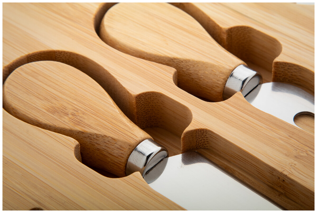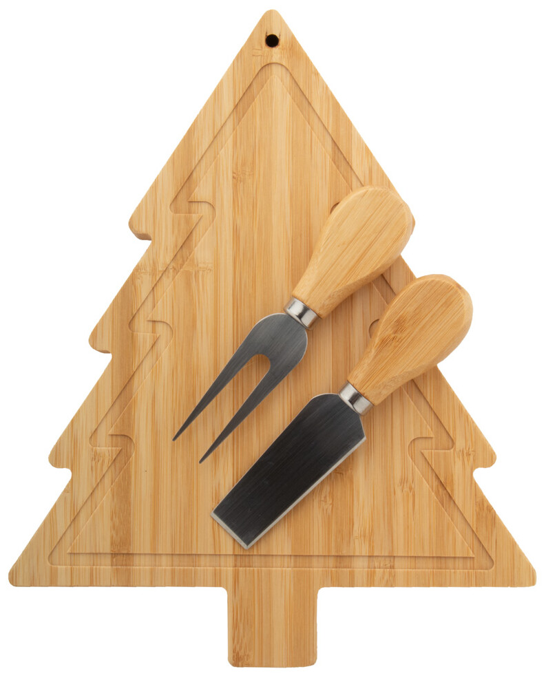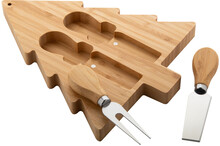 Sada bambusových nožů na sýr ve vánočním designu s prkénkem ve tvaru vánočního stromku a 2 nerezovými noži na sýr. V kraftové papírové krabici.