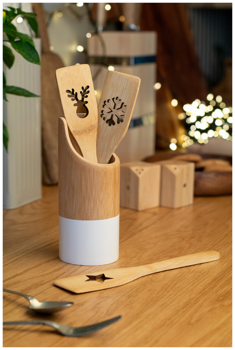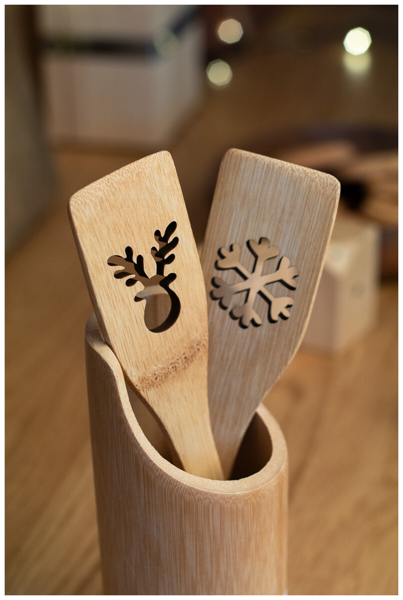 Vařečka z bambusu s vyřezaným vánočním stromečkem.