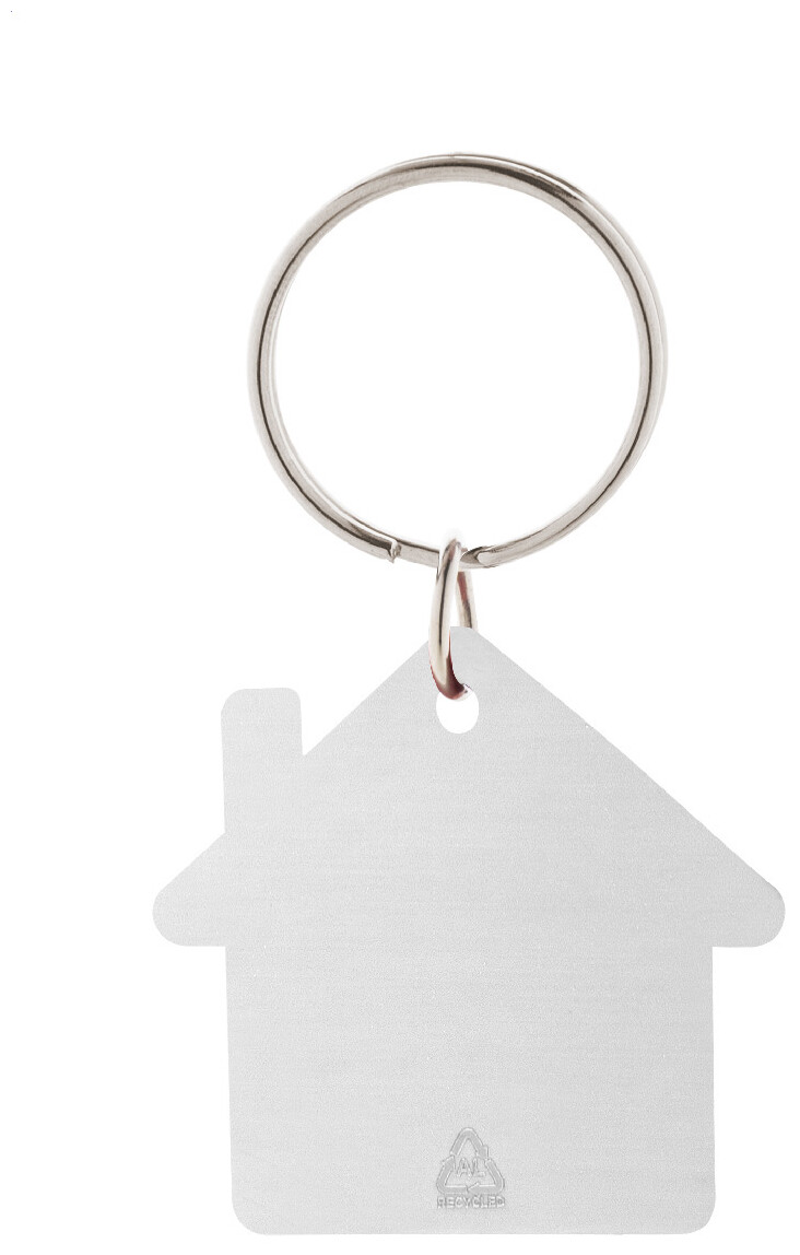 Přívěšek na klíče ve tvaru domečku z recyklovaného hliníku s kovovým kroužkem.