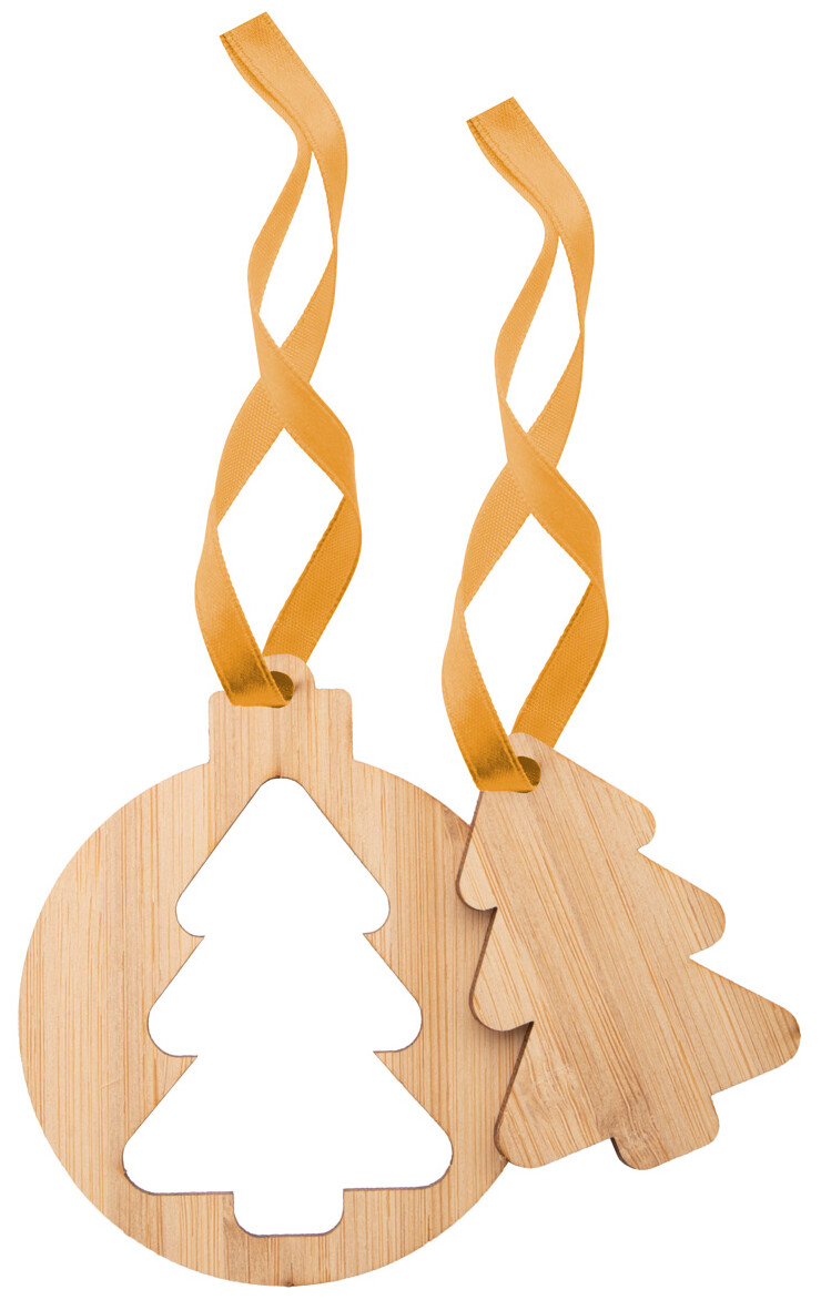 Vánoční ozdoba 2v1 z bambusové překližky se zlatou stuhou. Dodáváno s oddělenou stuhou.