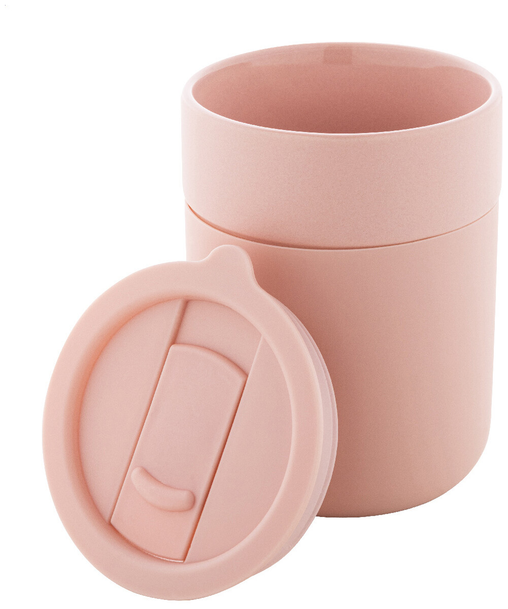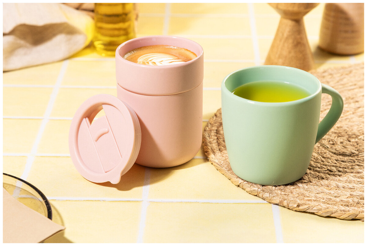 Keramický cestovní kelímek potažený silikonem s víčkem na pití z plastu PP. Objem 300 ml.
