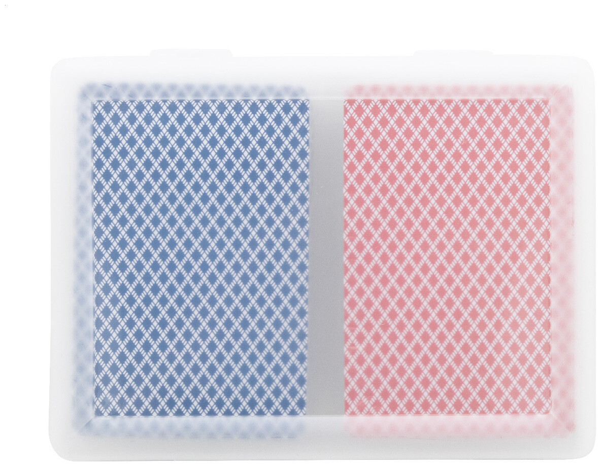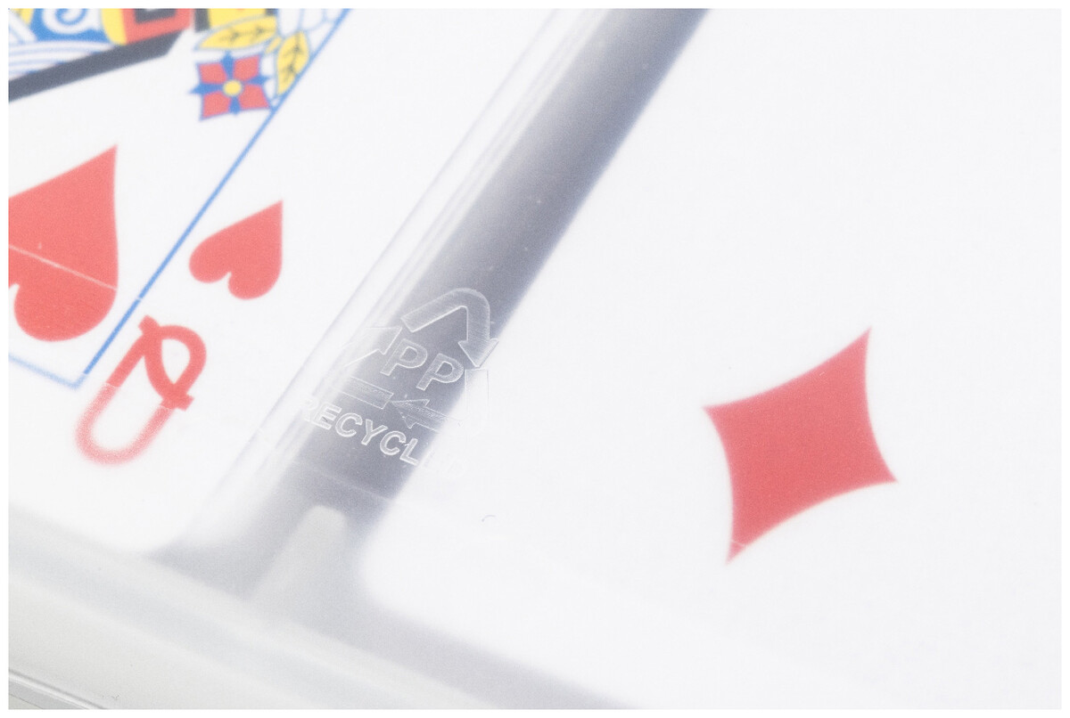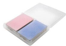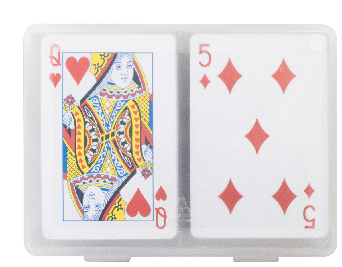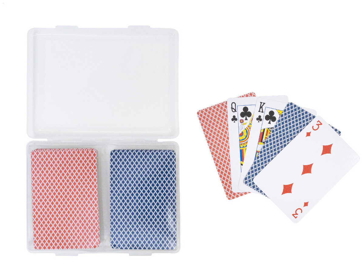 Sada klasických papírových hracích karet v recyklované PP krabičce. Obsahuje dva standardní balíčky 54 karet s červenou a modrou zadní stranou.