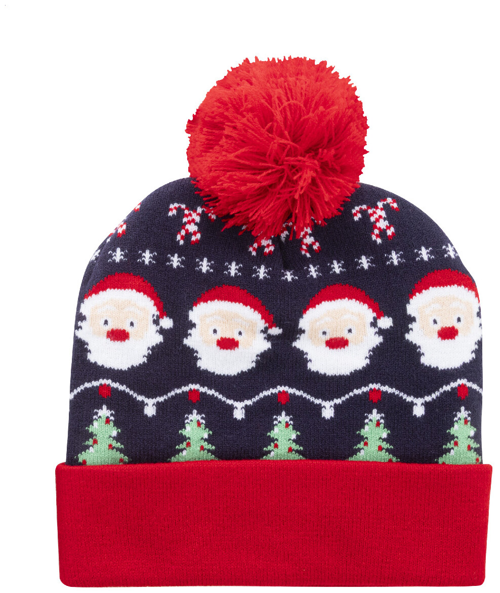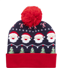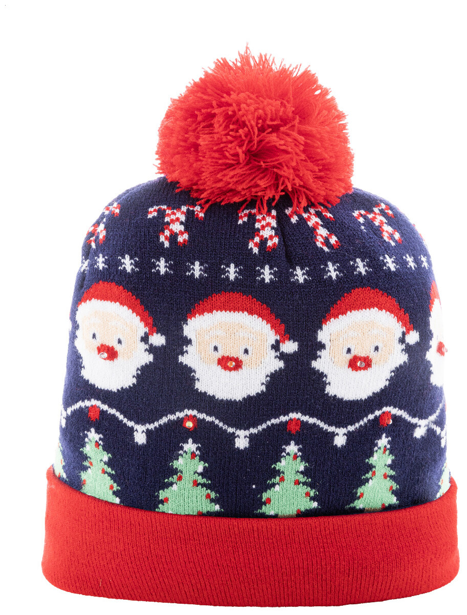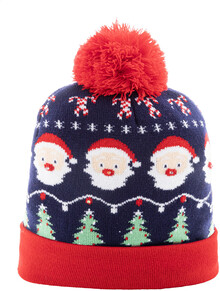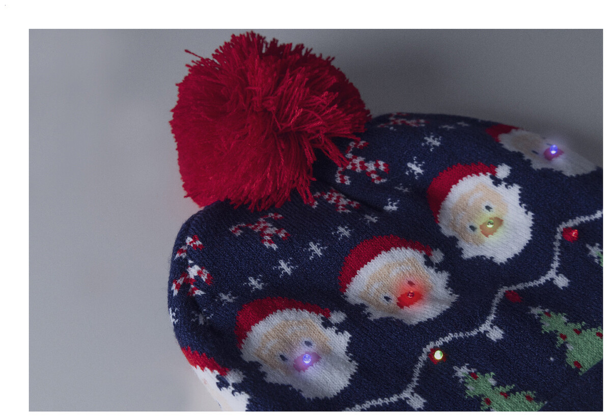 Pletená vánoční čepice z akrylu se 6 LED světly (3 režimy svícení), manžetou a bambulí. S knoflíkovou baterii.