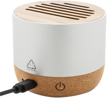Bezdrátový reproduktor v pouzdře z recyklovaného hliníku s bambusovou síťovinou a základnou z přírodního korku. S dobíjecí baterií (400 mAh). Včetně nabíjecího kabelu USB.