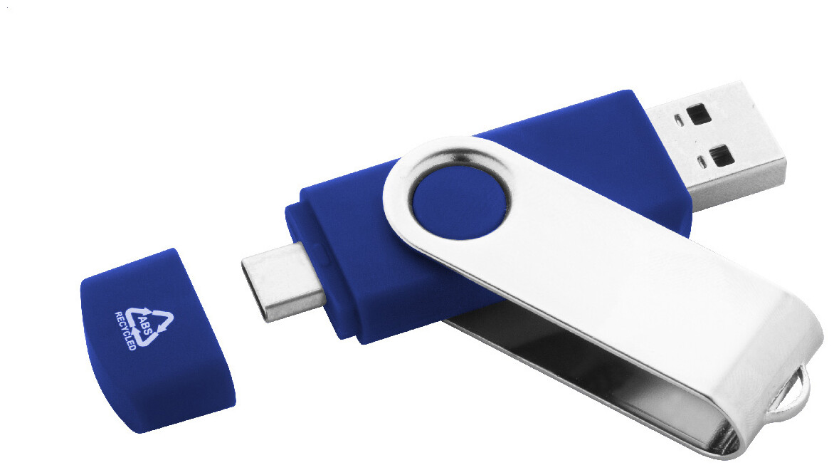 Otočný USB flash disk OTG v pouzdře z recyklovaného ABS a kovu s pamětí 8/16/32 GB. S připojeními USB a USB-C. USB 2.0.