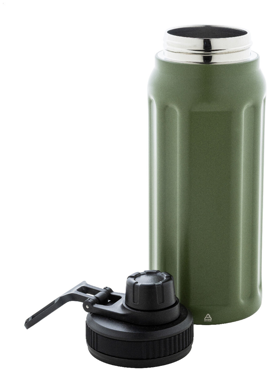 Dvoustěnná termoska z recyklované nerezové oceli s vertikálními drážkami. S víčkem z polypropylenu a s integrovaným držadlem. 540 ml.