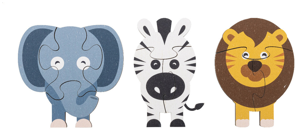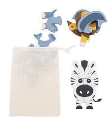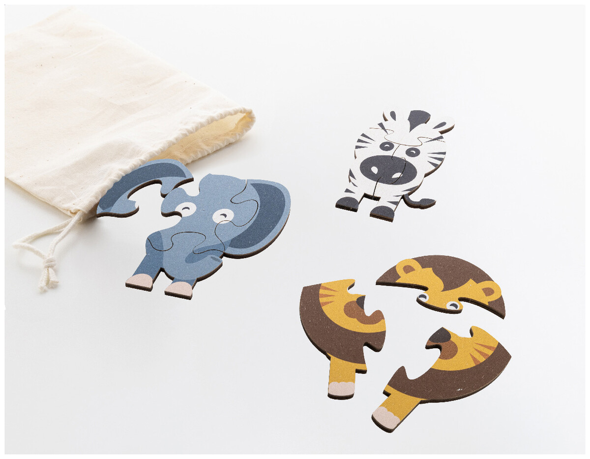 Dětská sada puzzle z březové překližky se 3 tematickými motivy. V bavlněném přepravním pytlíku.