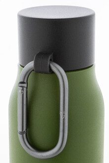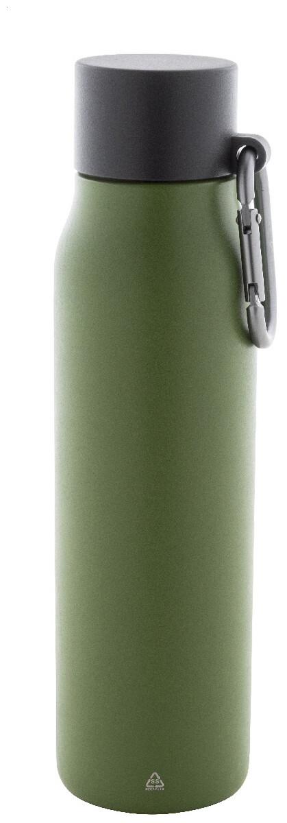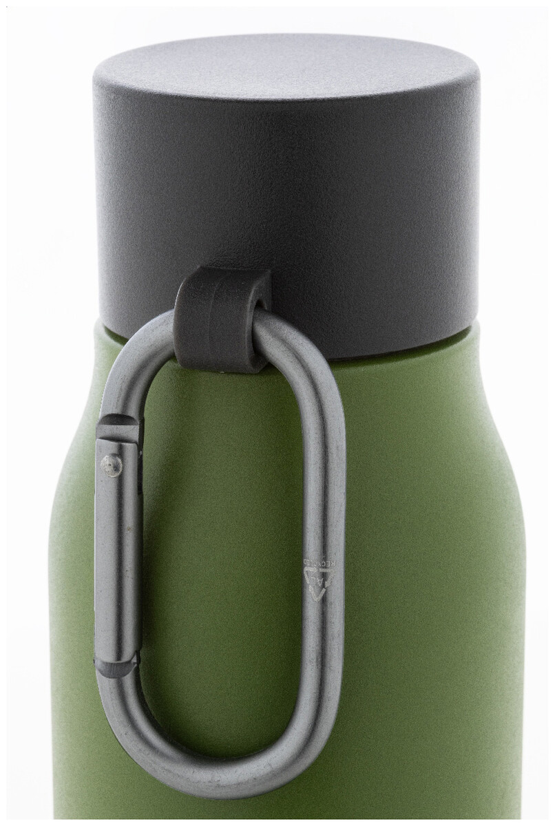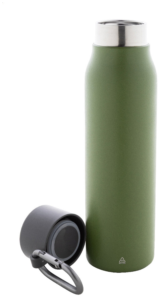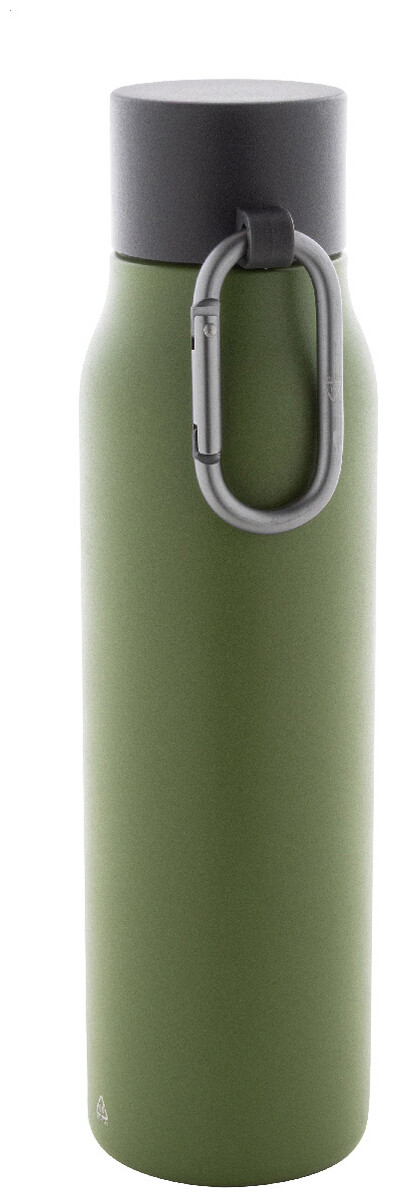 Dvoustěnná vakuová láhev z recyklované nerezové oceli s víčkem z PP a karabinou z recyklovaného hliníku. 500 ml.
