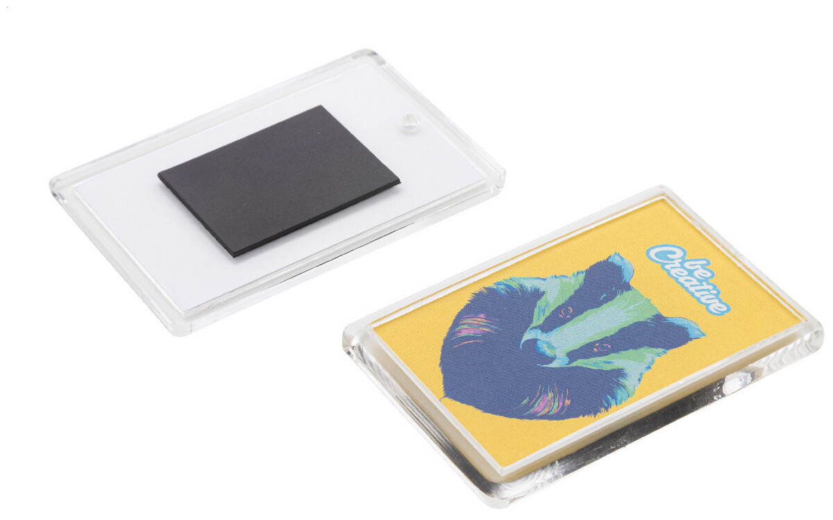 Obdélníkový akrylový magnet na ledničku s plnobarevnou papírovou vložkou na zakázku. Cena zahrnuje digitální tisk, cena nezahrnuje tiskovou přípravu. Min. mn.: 100 ks.