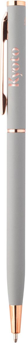 Kuličkové pero z recyklovaného hliníku s pogumovaným povrchem a detaily z růžového zlata. Se speciální povrchovou úpravou pro zrcadlové laserové gravírování v barvě růžového zlata. S modrou náplní.