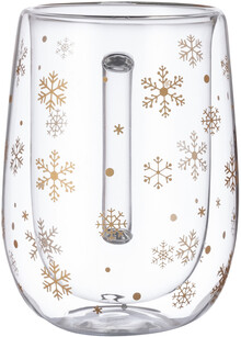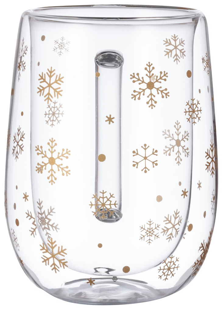 Dvoustěnný termohrnek z borosilikátového skla se vzorem sněhových vloček. 400 ml. V černé papírové krabici.