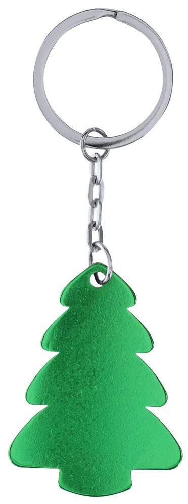 Přívěšek na klíče z recyklovaného hliníku ve tvaru vánočního stromku s kovovým kroužkem.