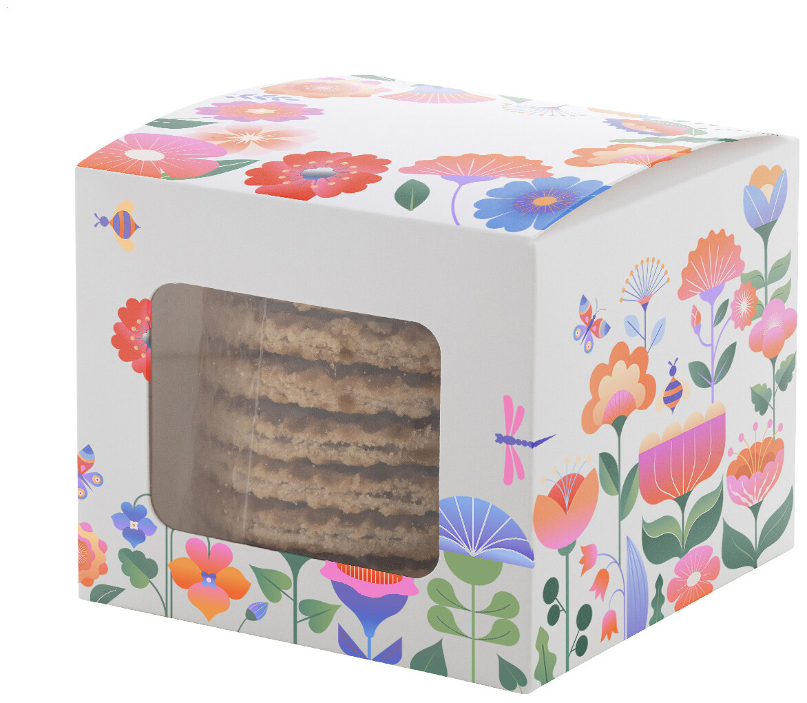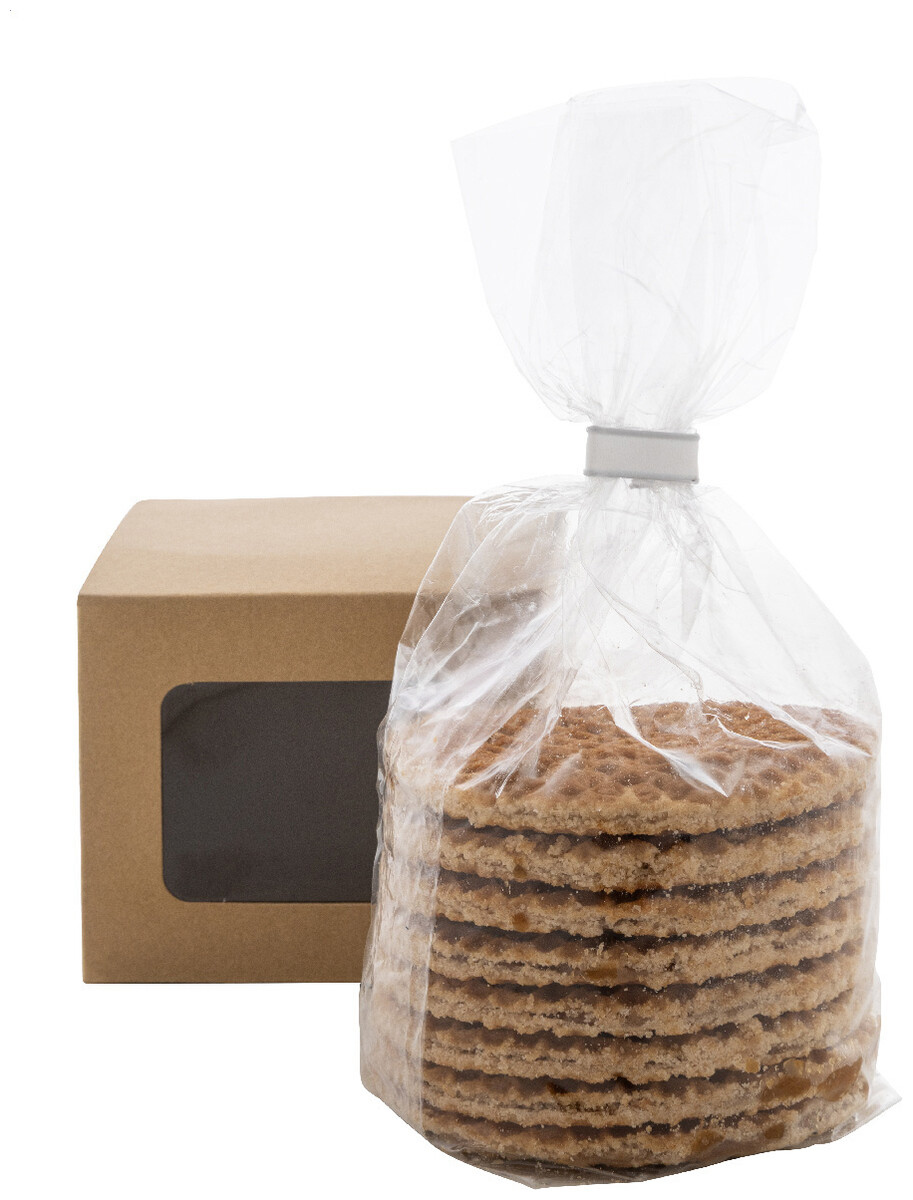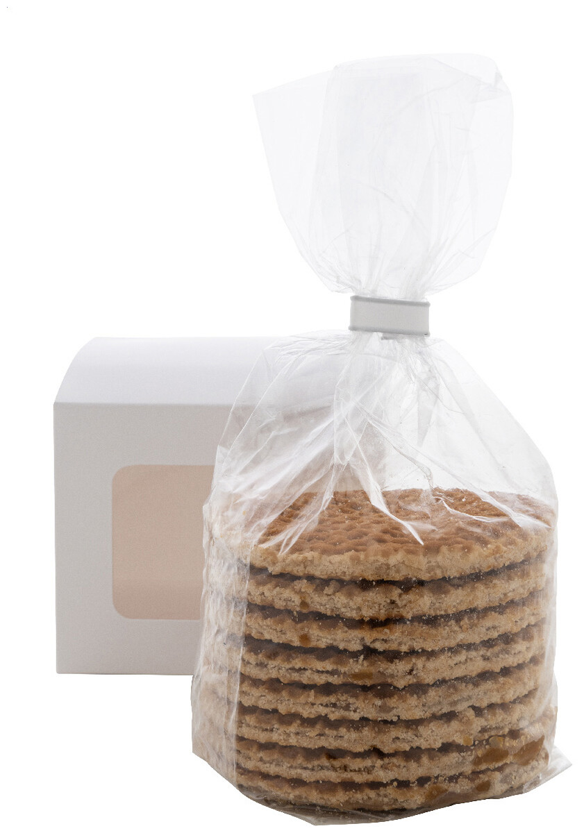 Pravé holandské stroopwafels (dva tenké plátky vafle plněné krémovým karamelovým sirupem) balené v plastovém sáčku. 8 kusů, 250 gramů. Lze přizpůsobit vinylovou samolepkou nebo plnobarevně potištěnou papírovou dárkovou krabičkou. Cena nezahrnuje tisk.