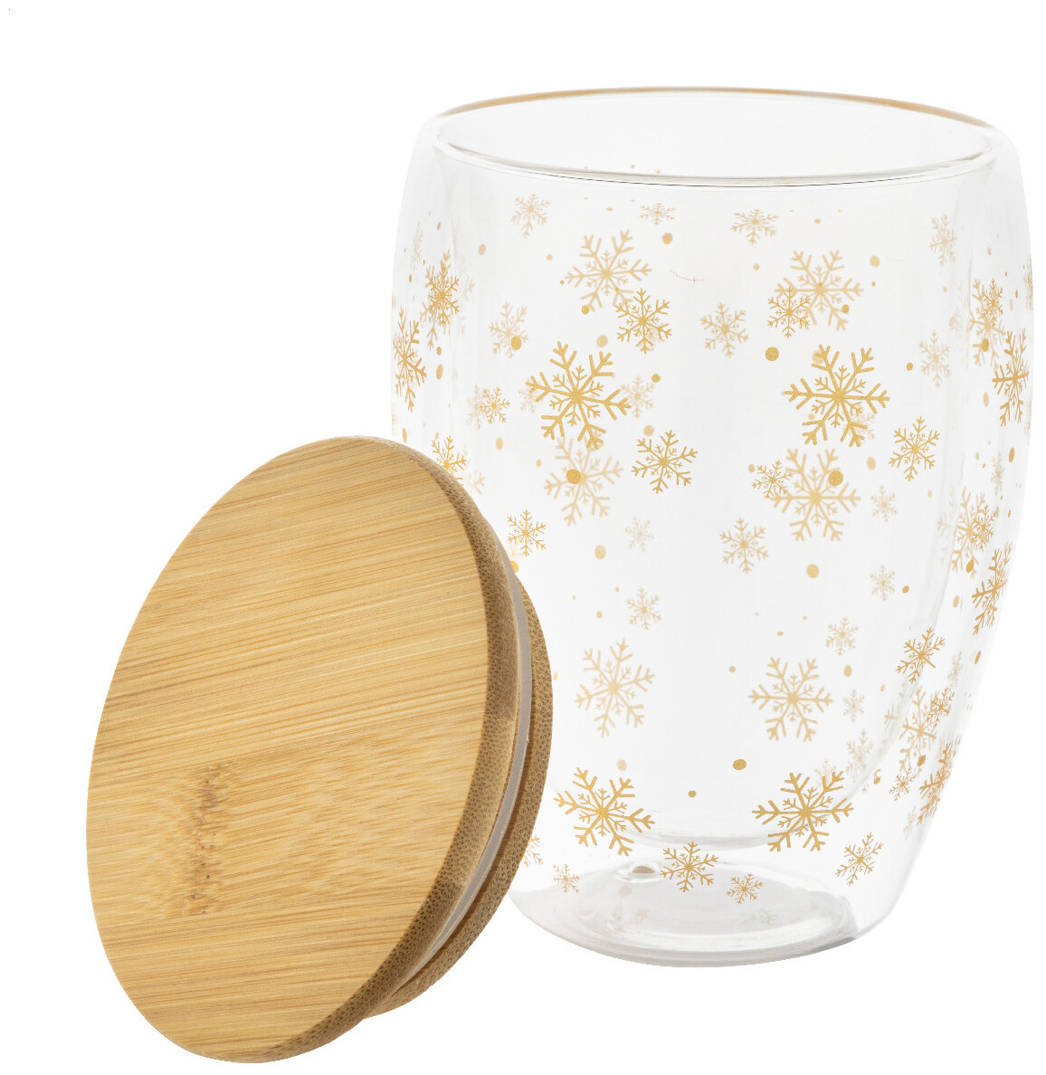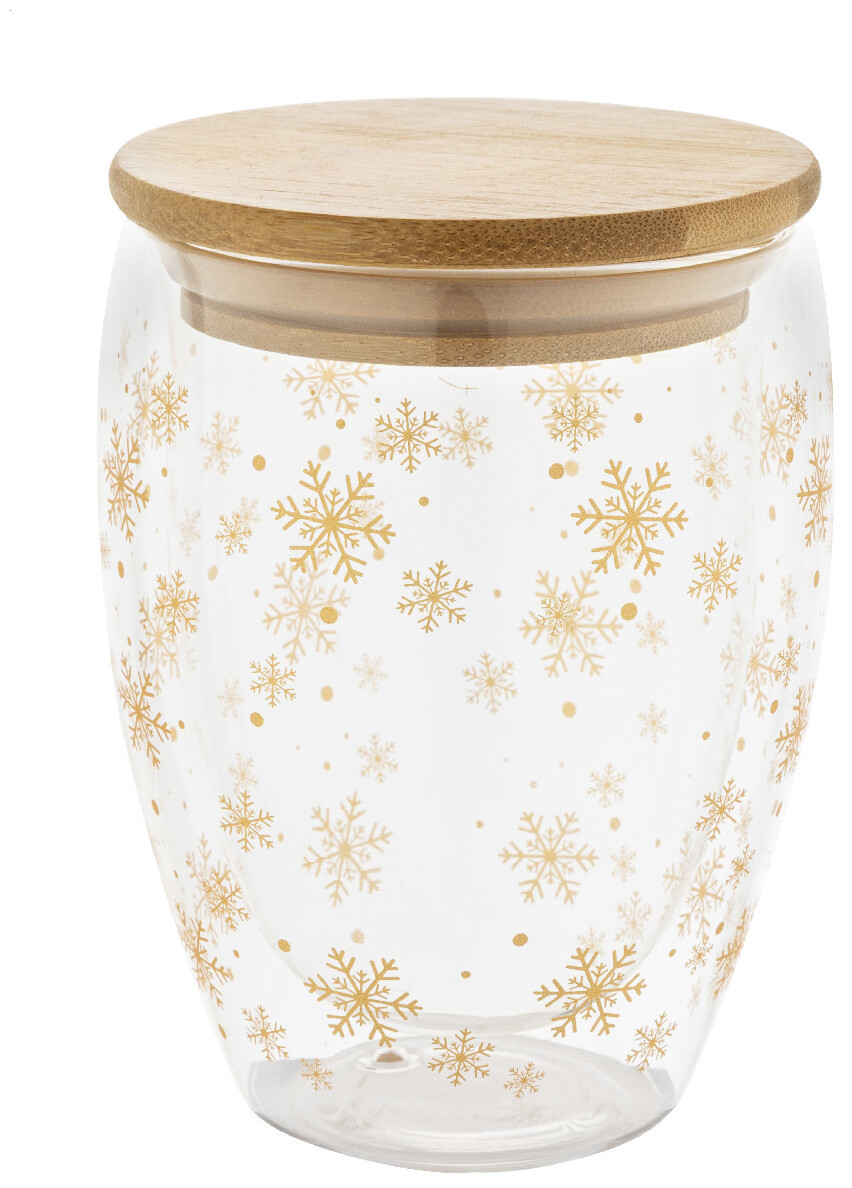 Dvoustěnný termohrnek z borosilikátového skla s vánočním motivem vloček a bambusovým víčkem, 310 ml. V krabičce z kraftového papíru.